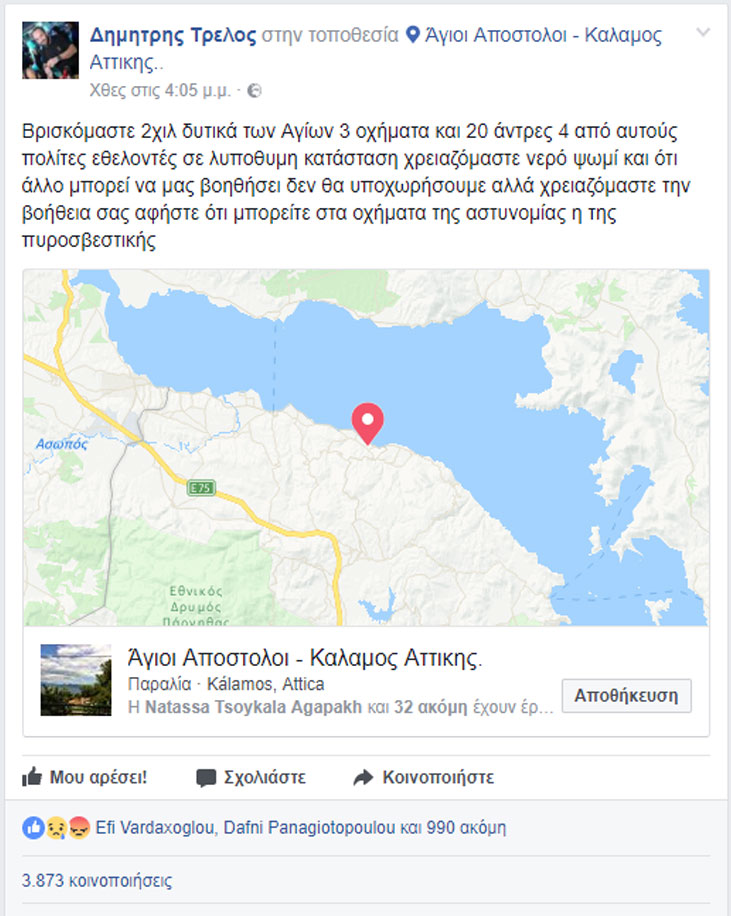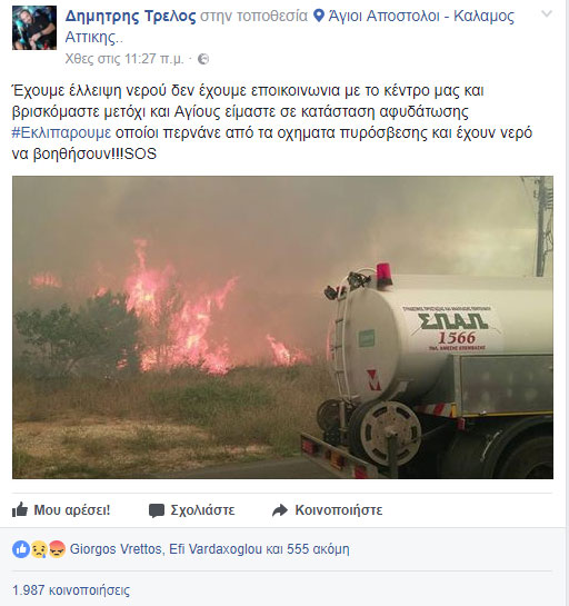 «Έχουμε έλλειψη νερού, δεν έχουμε επικοινωνία με το κέντρο μας και βρισκόμαστε Μετόχι και Αγίους. Είμαστε σε κατάσταση αφυδάτωσης #Εκλιπαρούμε όποιοι περνάνε από τα οχήματα πυρόσβεσης και έχουν νερό να βοηθήσουν!!!SOS», έγραψε αρχικά χθες.