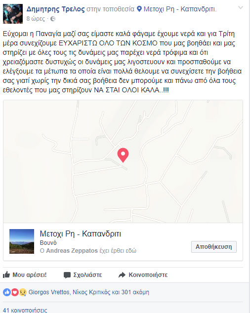 Ο ίδιος, μετά από λίγες μόλις ώρες, ευχαρίστησε δημόσια τον κόσμο, τονίζοντας: «Εύχομαι η Παναγία μαζί σας, είμαστε καλά, φάγαμε, έχουμε νερά και για τρίτη μέρα συνεχίζουμε. ΕΥΧΑΡΙΣΤΩ ΟΛΟ ΤΩΝ ΚΟΣΜΟ που μας βοηθάει και μας στηρίζει με όλες τους τις δυνάμεις. Μας παρέχει νερά, τρόφιμα και ό,τι χρειαζόμαστε. Δυστυχώς οι δυνάμεις μας λιγοστεύουν και προσπαθούμε να ελέγξουμε τα μέτωπα, τα οποία είναι πολλά. Θέλουμε να συνεχίσετε την βοήθεια σας, γιατί χωρίς την δικιά σας βοήθεια, δεν μπορούμε και πάνω από όλα τους εθελοντές που μας στηρίζουν. ΝΑ ‘ΣΤΕ ΟΛΟΙ ΚΑΛΑ!!!»