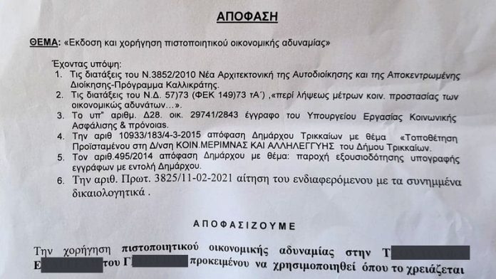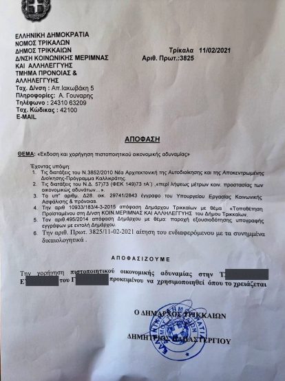 Από την αρμόδια υπηρεσία του Δήμου Τρικκαίων εγκρίθηκε και εκδόθηκε το πιστοποιητικό οικονομικής αδυναμίας.
