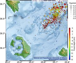 Από την έναρξη της σεισμικής δραστηριότητας στη ζώνη Σαντορίνης-Αμοργού στις 26 Ιανουαρίου έως και τις 10 Φεβρουαρίου 2025, το Εργαστήριο Σεισμολογίας (ΕΣ) του ΕΚΠΑ (http://dggsl.geol.uoa.gr/) έχει ανιχνεύσει και εντοπίσει συνολικά, με αυστηρά κριτήρια για τη διασφάλιση της ποιότητας των αποτελεσμάτων, πάνω από 15.300 σεισμούς με μεθόδους μηχανικής μάθησης, εκ των οποίων άνω των 13,200 με μεγέθη Μ³1.0. Στις 10 Φεβρουαρίου καταγράφηκαν πάνω από 1,200 σεισμοί, με ~240 να έχουν μέγεθος Μ³2.5, 13 σεισμούς με Μ³4.0, και 4 σεισμούς με Μ³4.5, με τον μεγαλύτερο σεισμό να έχει μέγεθος 5.2. Σύμφωνα με τα στοιχεία καθημερινής ανάλυσης σεισμικών δεδομένων του Εργαστηρίου Σεισμολογίας του ΕΚΠΑ (χωρίς χρήση μεθόδων μηχανικής μάθησης), κατά την 11η Φεβρουαρίου έχουν καταγραφεί πάνω από 100 σεισμοί, εκ των οποίων 16 με μεγέθη M≥4.0 και 4 με Μ≥4.5, ενώ ο μεγαλύτερος σεισμός σημειώθηκε στις 09:17:20 τοπική ώρα και είχε μέγεθος 4.8.