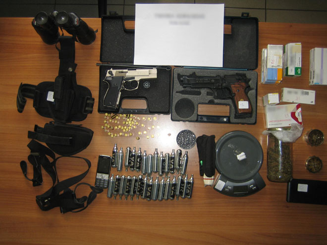 • ένα μεταλλικό κουτί που περιείχε πληθώρα μεταλλικών σφαιριδίων αεροβόλου όπλου