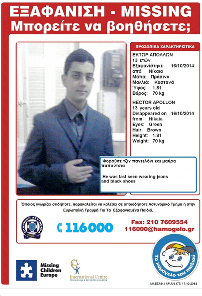 Στις 16 Οκτωβρίου 2014, στις 16:00, εξαφανίστηκε από το σπίτι του στη Νίκαια ο Έκτωρ – Απόλλων, 13 ετών.