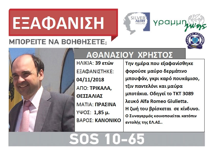 Την εξαφάνιση ενός 39χρονου άνδρα από τα Τρίκαλα Θεσσαλίας, γνωστοποιεί με ανακοίνωσή της, η Γραμμή Ζωής.