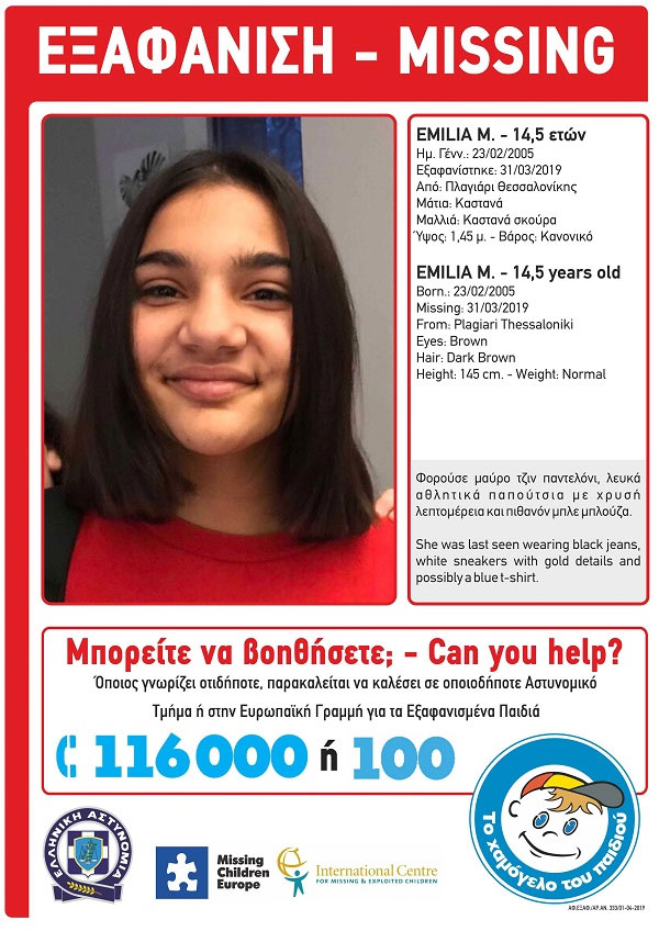 Συναγερμός έχει σημάνει για την εξαφάνιση ανήλικης στη Θεσσαλονίκη. Τα ίχνη της Emilia Μ. ηλικίας 14,5 ετών χάθηκαν από το Πλαγιάρι την Κυριακή 31 Μαρτίου στις 13:30.