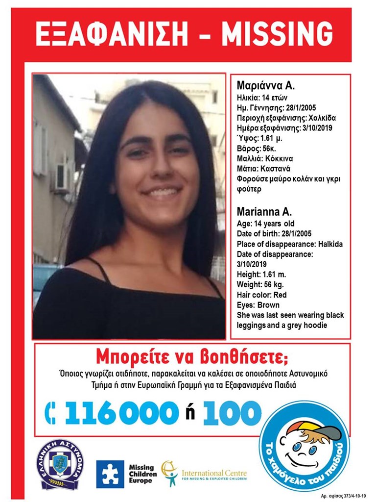 Όπως αναφέρει σε ανακοίνωσή του, στις 03/10/2019 και ώρα 22:00, εξαφανίστηκε από την περιοχή της Χαλκίδας, η Μαριάννα Α., 14 ετών.