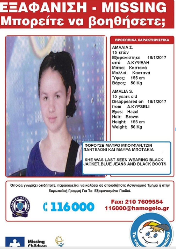 Στις 18/01/2017, μεσημβρινές ώρες, εξαφανίστηκε από την περιοχή της Άνω Κυψέλης, η Αμαλία Σ., 15 ετών.