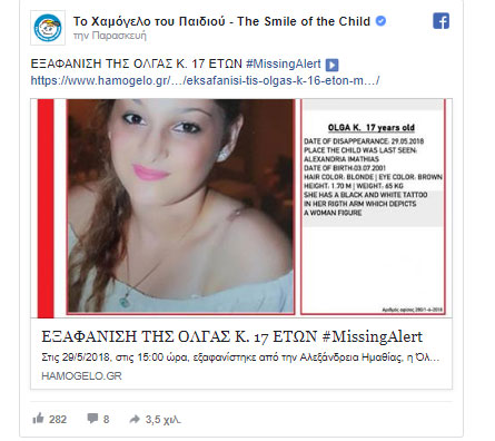 Η ανακοίνωση αναφέρει: «στις 29/5/2018, στις 15:00 ώρα, εξαφανίστηκε από την Αλεξάνδρεια Ημαθίας, η Όλγα Κ., 17 ετών. Η Όλγα Κ. έχει ύψος 1,70 μ., ζυγίζει 65 κιλά, έχει ξανθά μαλλιά και καστανά μάτια. Η Όλγα έχει τατουάζ στο δεξί της χέρι που απεικονίζει γυναικεία φιγούρα.