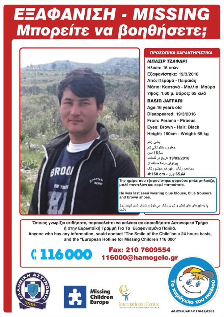 Στις 19 Μαρτίου 2016, στις 16.00, εξαφανίστηκε από τo Kέντρο Μεταναστών της περιοχής του Σχιστού Περάματος Πειραιά ο Μπασίρ Tζαφάρι, αφγανικής καταγωγής, 16 ετών. Ο Μπασίρ έχει ύψος 1.60 μ. και βάρος 65 κιλά. Έχει μαύρα μαλλιά και καστανά μάτια. Την ημέρα που εξαφανίστηκε, φορούσε μπλε παντελόνι, μπλε μπλούζα και καφέ παπούτσια.