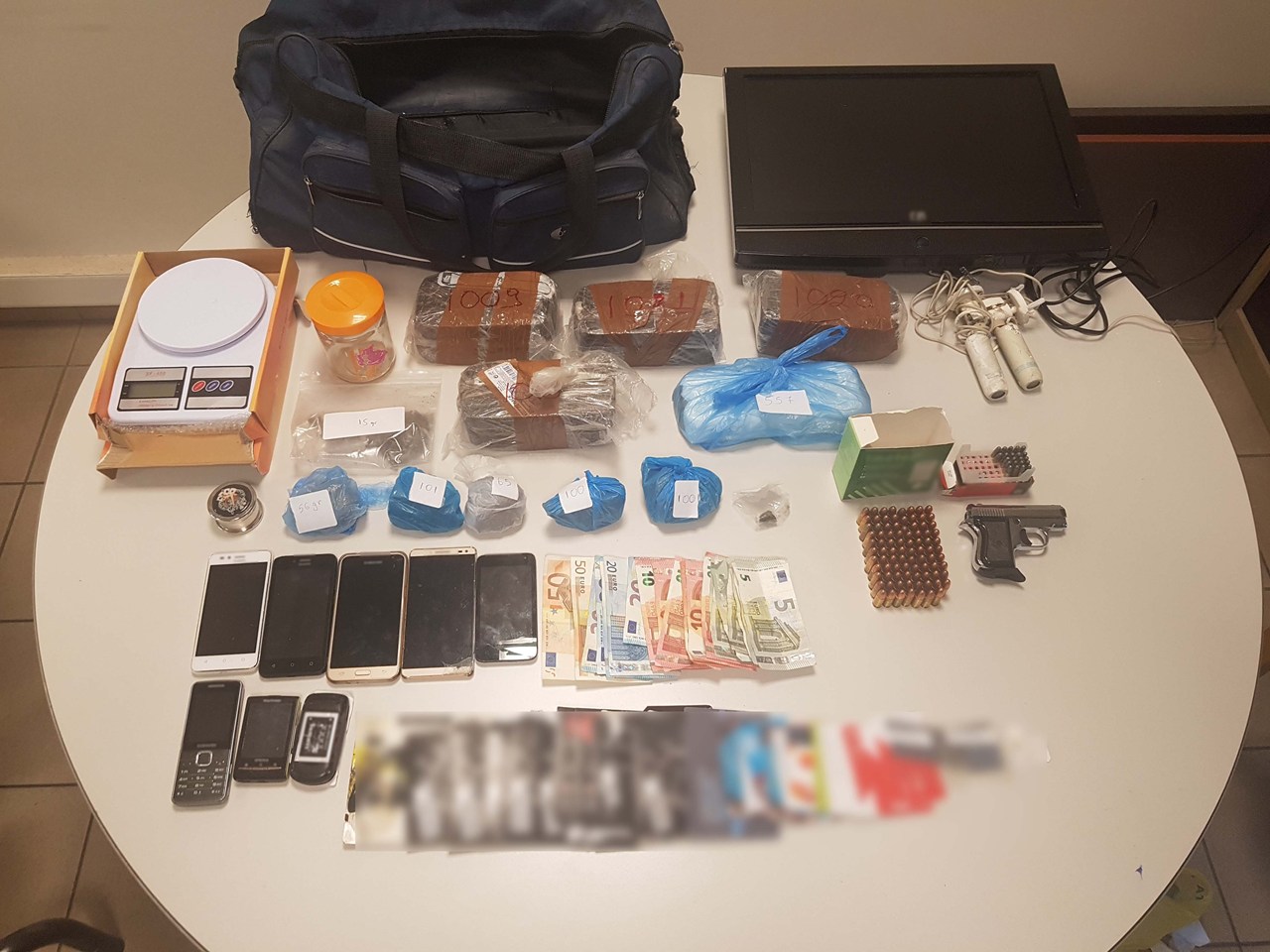 – από την κατοχή των μελών της συμμορίας, το χρηματικό ποσό των 1.800 ευρώ ως προερχόμενο από εμπορία ναρκωτικών ουσιών, έξι κινητά τηλέφωνα και μία κάρτα sim, που χρησιμοποιούσαν για τις παράνομες συναλλαγές τους και 22 ναρκωτικά δισκία
