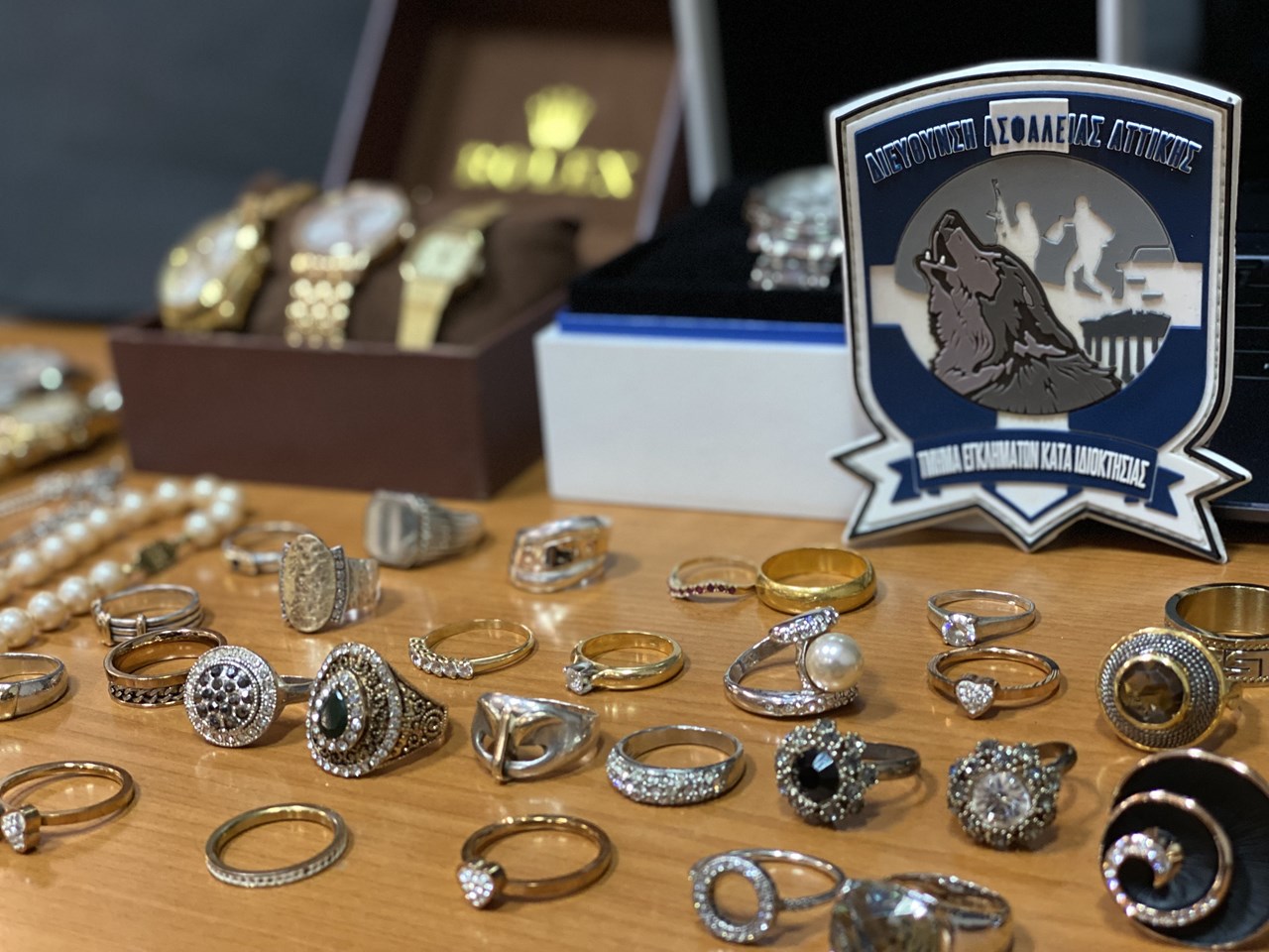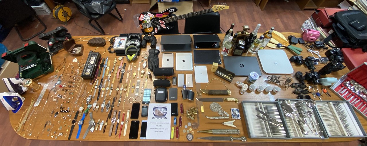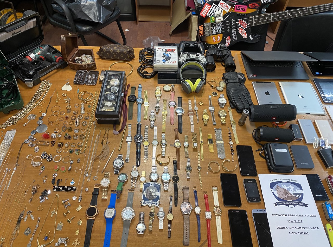 Από τις έρευνες βρέθηκε και κατασχέθηκε πλήθος από κοσμήματα, ασημικά, ρολόγια, επώνυμα δερμάτινα είδη, ηλεκτρονικές συσκευές, φορητούς ηλεκτρονικούς υπολογιστές, μουσικά όργανα, αλκοολούχα ποτά, κινητά τηλέφωνα, αποδείξεις και κάρτες μεταφοράς χρημάτων, συναλλαγές με ενεχυροδανειστήρια, διαρρηκτικά εργαλεία, κλειδαριές, -2- “επιχειρησιακά” αυτοκίνητα και το χρηματικό ποσό των -6.220- ευρώ.