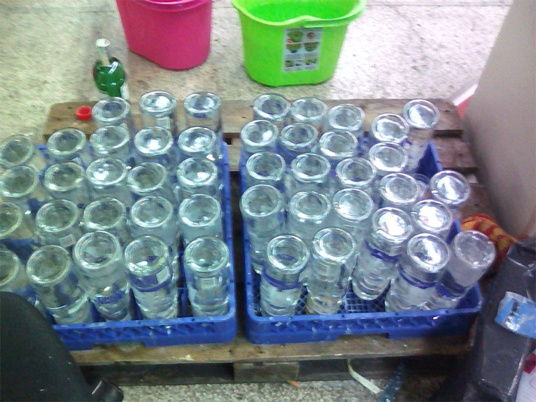 Επίσης, στον χώρο βρέθηκαν αναποδογυρισμένες φιάλες ποτών σε ποτήρια γεμάτα με υγρό, προκειμένου να αποκολληθεί η ταινία ασφαλείας από το καπάκι της φιάλης, βουλγαρικής προέλευσης.