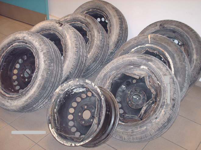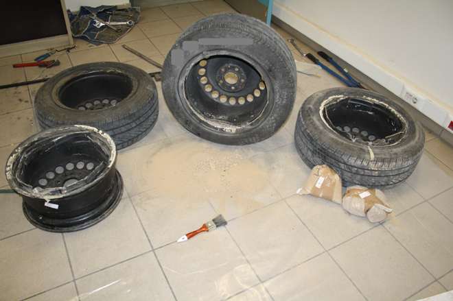 • οκτώ ζάντες αυτοκινήτου, κατάλληλα τροποποιημένες για απόκρυψη ναρκωτικών ουσιών