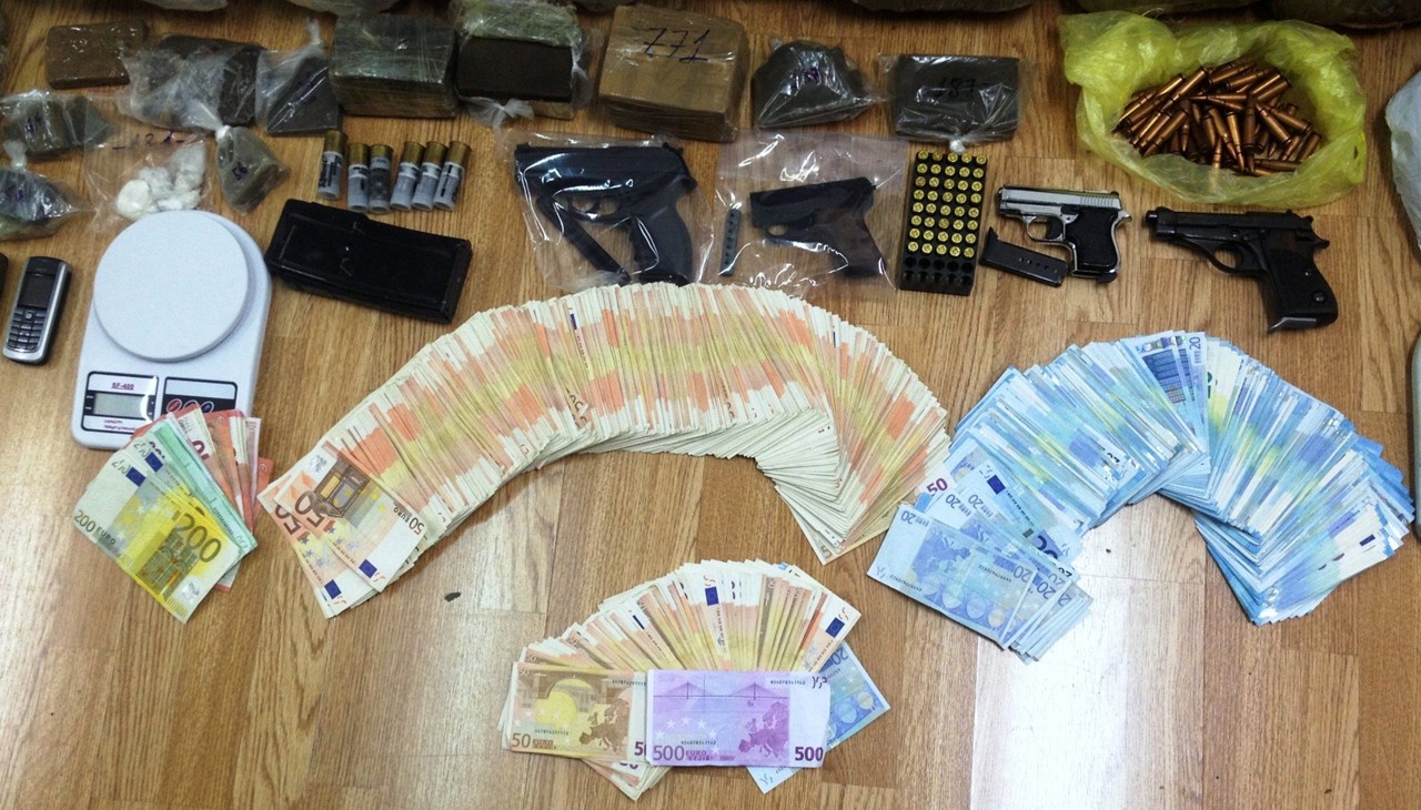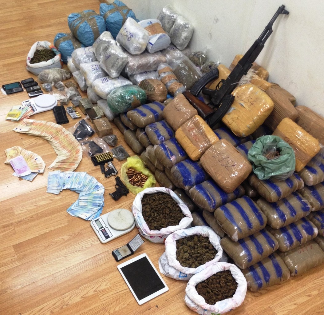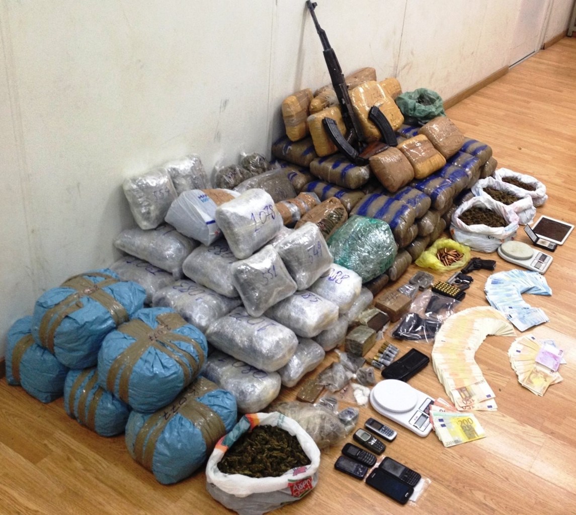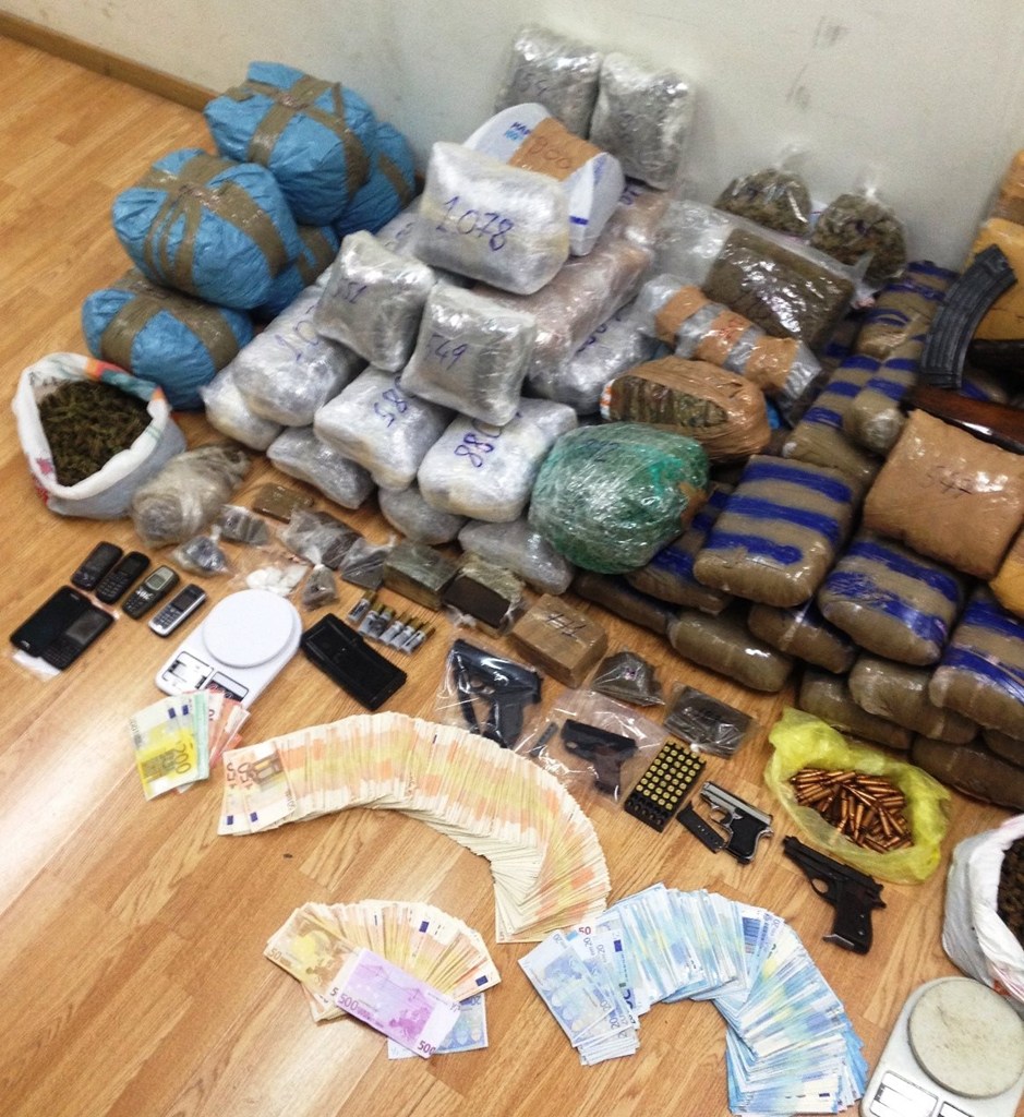 Μετά από έρευνες που πραγματοποιήθηκαν σε οικίες, αποθηκευτικούς χώρους και οχήματα, συνολικά βρέθηκαν και κατασχέθηκαν, μεταξύ άλλων: Ποσότητα ακατέργαστης κάνναβης βάρους 143 κιλών και 760 γραμμαρίων, κατεργασμένη κάνναβη βάρους 25 κιλών και 379 γραμμαρίων, 19 γραμμάρια κοκαΐνης, 53 γραμμάρια σπόρων κάνναβης, το χρηματικό ποσό των 62.255 ευρώ, ένα καλάσνικοφ, δύο πιστόλια, 318 φυσίγγια διαφόρων διαμετρημάτων, πέντε γεμιστήρες διαφόρων όπλων, ένα παραλυτικό σπρέι, πέντε Ι.Χ. αυτοκίνητα, μία μοτοσυκλέτα και πλαστά χαρτονομίσματα.