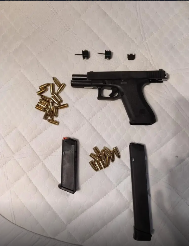 -2- σπαθιά, -2- μαχαίρια, πιστόλι, -2- γεμιστήρες, -32- φυσίγγια, -3- κομμάτια κλείστρου για μετατροπή σε αυτόματο όπλο, πιστόλι σε απομίμηση, ζευγάρι χειροπέδες, πιστόλι αερίου, αεροβόλο πιστόλι,