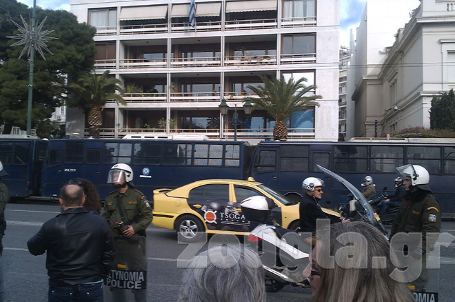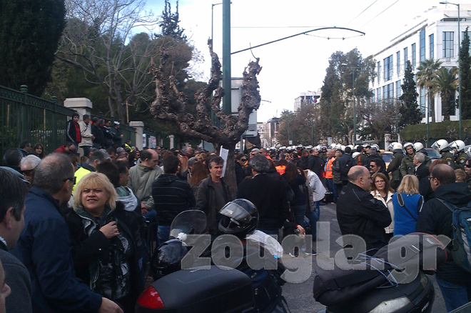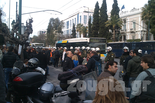Αυτήν την ώρα έξω από το υπουργείο έχουν συγκεντρωθεί περίπου 250 άτομα, τα οποία περιφρουρούνται από έξι κλούβες των ΜΑΤ.