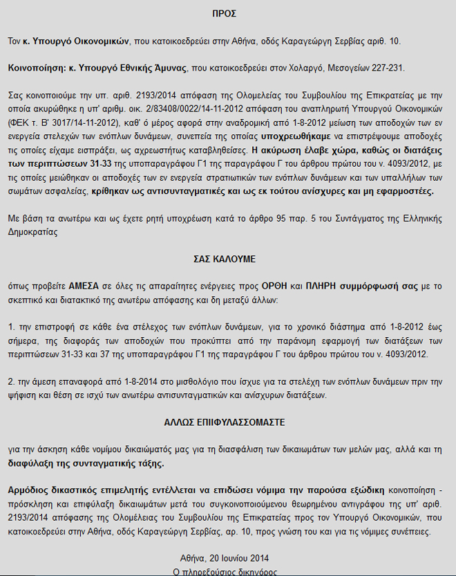Σε εξώδικη κοινοποίηση – πρόσκληση και επιφύλαξη δικαιωμάτων, ενώπιον δικαστηρίου και κάθε άλλης αρμόδιας αρχής, προχώρησε η Ομοσπονδία Στρατιωτικών, με την έκδοση της υπ΄ αριθμ. 2193/2014 απόφασης του Συμβουλίου της Επικρατείας, ζητώντας από τον Υπουργό Οικονομικών να προβεί άμεσα σε όλες τις απαραίτητες ενέργειες προς ορθή και πλήρη συμμόρφωσή του με το σκεπτικό και διατακτικό της ανωτέρω απόφασης και δη μεταξύ άλλων: