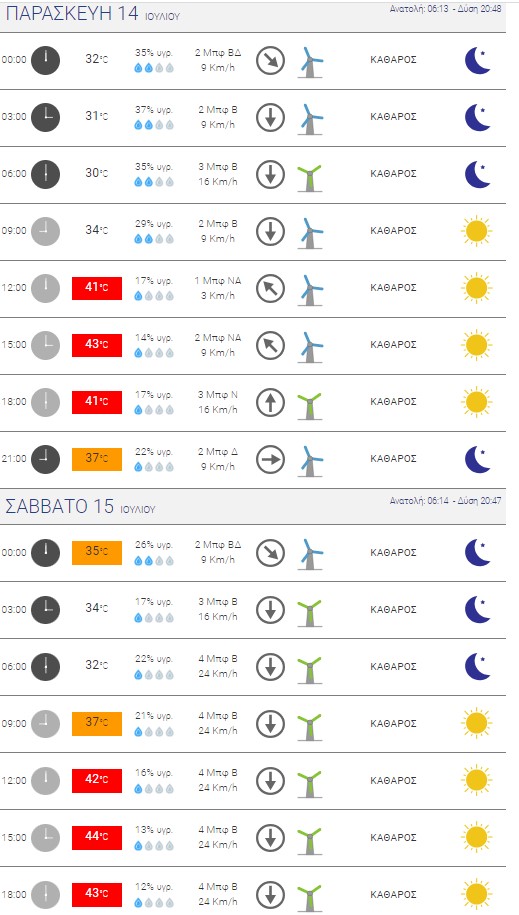 β. Στα υπόλοιπα ηπειρωτικά τους 40 με 41, στο εσωτερικό της Στερεάς και της Πελοποννήσου τους 41 με 42 και στο εσωτερικό της Θεσσαλίας τους 43 βαθμούς Κελσίου ενώ οι ελάχιστες τιμές θα κυμανθούν περί τους 29 με 31 βαθμούς Κελσίου.