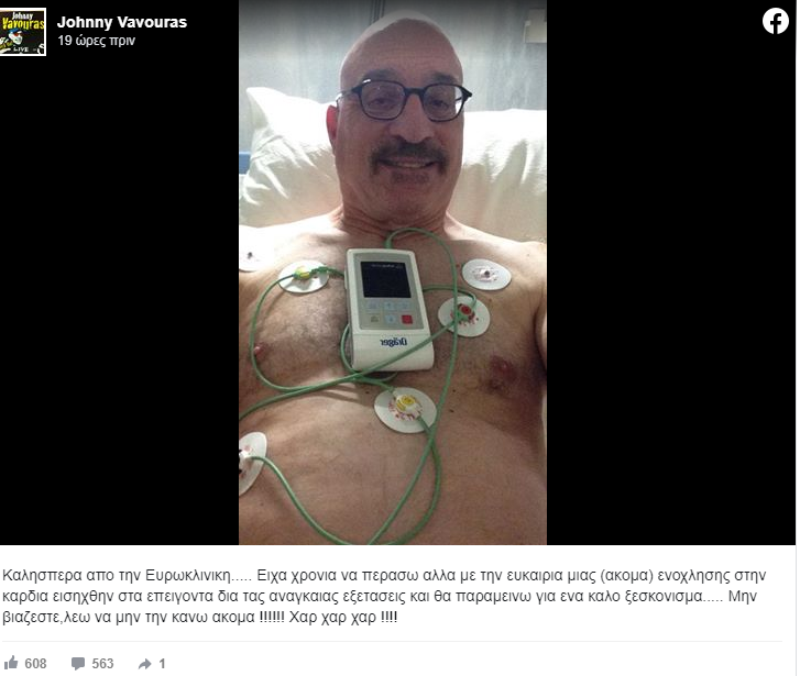Την είδηση έκανε γνωστή ο ίδιος μέσα από μια ανάρτηση που έκανε στον προσωπικό του λογαριασμό στο Facebook γράφοντας: «Καλησπέρα από την Ευρωκλινική….. Είχα χρόνια να περάσω αλλά με την ευκαιρία μιας (ακόμα) ενόχλησης στην καρδιά εισήχθην στα επείγοντα δια τας αναγκαίας εξετάσεις και θα παραμείνω για ένα καλό ξεσκόνισμα….. Μην βιάζεστε, λέω να μην την κάνω ακόμα !».