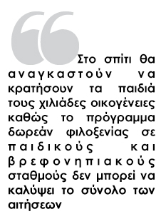 Οι προβλεπόμενες θέσεις του προγράμματος είναι 89.600. Ωστόσο, τα διαθέσιμα κονδύλια, ύψους 160 εκατ. ευρώ, επαρκούν για την κάλυψη των αναγκών μόνο 62.000 παιδιών. Ως αποτέλεσμα, περίπου 25.000-30.000 θα μείνουν εκτός παιδικών σταθμών. Βασικό πρόβλημα που παρατηρείται είναι και η ύπαρξη κενών θέσεων σε διάφορες περιοχές καθώς και η υπερπληθώρα αιτήσεων για άλλες. Προς αυτήν, εξάλλου, την κατεύθυνση είχε δοθεί και οδηγία στους γονείς να αναγράφουν στην αίτηση δεύτερη και τρίτη εναλλακτική φιλοξενίας.