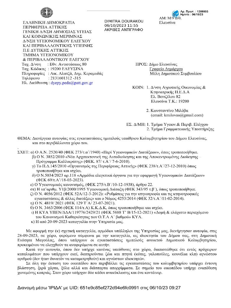 Συγκεκριμένα σύμφωνα με την υπ. αριθμ. Πρωτ. 1209903/ 06-10-2023 Αυτοψία που κοινοποιήθηκε προς τον δήμο Ελευσίνας, το Γραφείο δημάρχου και τα μέλη του δημοτικού συμβουλίου η Διεύθυνσης Υγειονομικού ελέγχου και Περιβαλλοντικής Υγιεινής Δυτικής ζήτησε από τον δήμο λόγω δικαιοδοσίας να φροντίσει για την αποψίλωση, τον καθαρισμό της εν λόγω έκτασης, την απομάκρυνση των σταυλικών εγκαταστάσεων των ζώων & πτηνών από το χώρο, που σύμφωνα με τη νομοθεσία δεν μπορούν να υφίστανται εκεί χωρίς τις απαιτούμενες άδειες και εγκρίσεις καθώς και την απομάκρυνση όσων διαμένουν εκεί δημιουργώντας ανθυγιεινή εστία. Επίσης να υπάρχει περίφραξη και φύλαξη στον συγκεκριμένο χώρο.