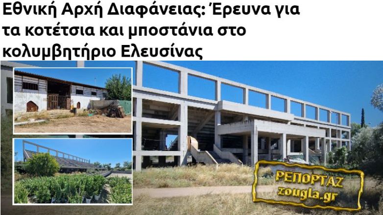 Επισημαίνουμε ότι η δημοσιογραφική έρευνα του zougla.gr για την μετατροπή των εγκαταστάσεων του Δημοτικού Κολυμβητηρίου Ελευσίνας σε μποστάνια, κοτέτσια και σύγχρονα φυτώρια, προκάλεσε τόσο την αυτεπάγγελτη επέμβαση του προϊσταμένου της Εισαγγελίας Πρωτοδικείου Αθηνών Αντώνιου Ελευθεριάνου όπου διατάχθηκε κατεπείγουσα Εισαγγελική έρευνα η οποία σήμερα βρίσκεται σε ποινική εξέλιξη.