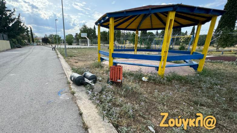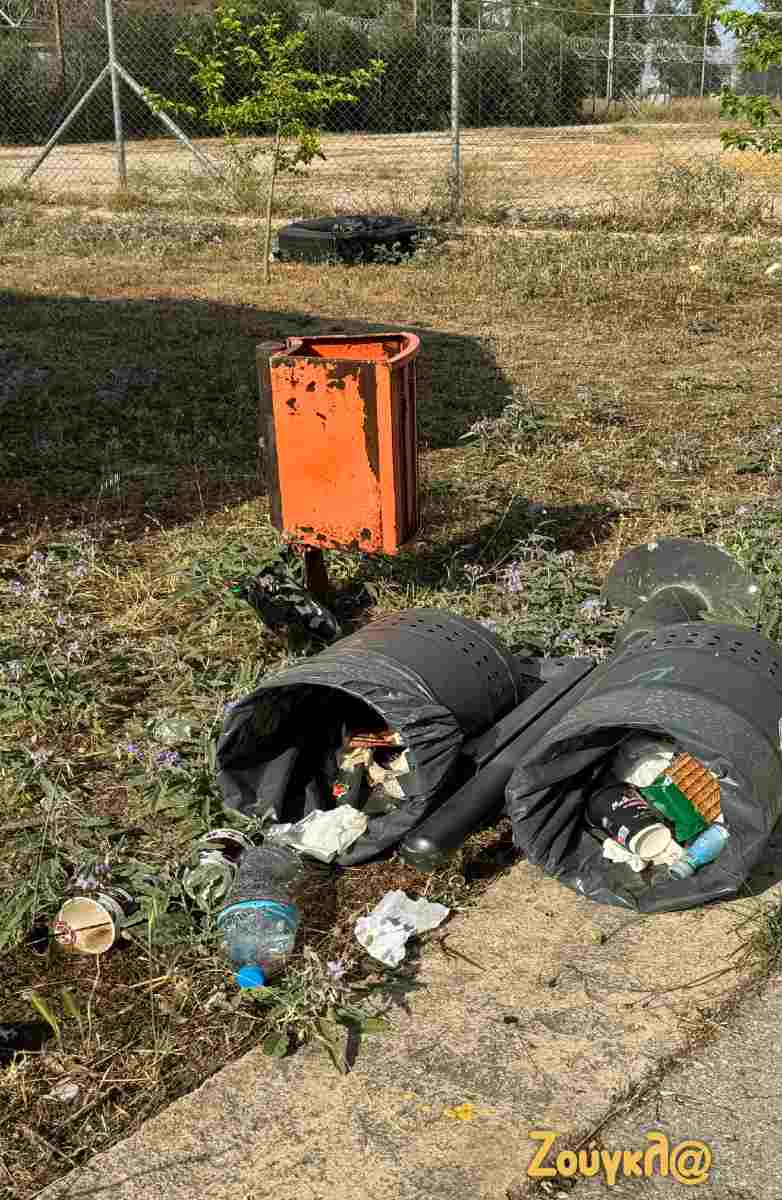 Ξηλωμένοι τάπητες, σπασμένα παιχνίδια και κάδοι, παρατημένα ξερόχορτα που προέρχονται από καθαρισμό του χώρου παρατημένα στη μέση της πλατείας.