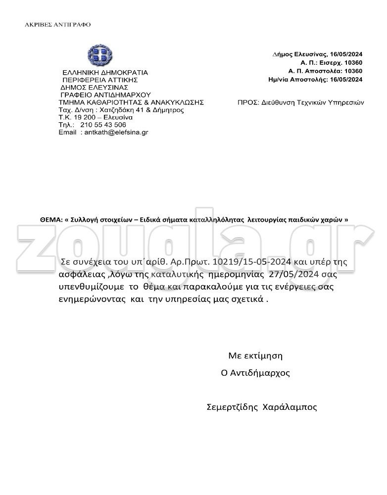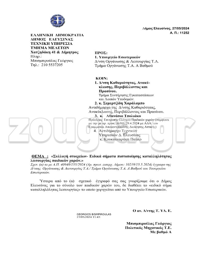 Με βάση τα έγγραφα που έχει στην διάθεση της η zougla και παρουσιάζει σήμερα, ο αντιδήμαρχος καθαριότητας και ανακύκλωσης για να αποφύγει τόσο τις ευθύνες του για την επικίνδυνη κατάσταση των παιδικών χαρών του δήμου όσο και τους γονείς που σχεδόν καθημερινά απαιτούσαν να φτιαχτούν οι κοινόχρηστοι χώροι απέστειλε στις 16 Μαΐου 2024 αίτημα με αριθμό Πρωτ. 10360 προς την Τεχνική Υπηρεσία Ελευσίνας ζητώντας από το Τμήμα να προβεί σε ενέργειες για την απόκτηση των ειδικών σημάτων καταλληλόλητας για την λειτουργία των παιδικών χαρών(!!!)