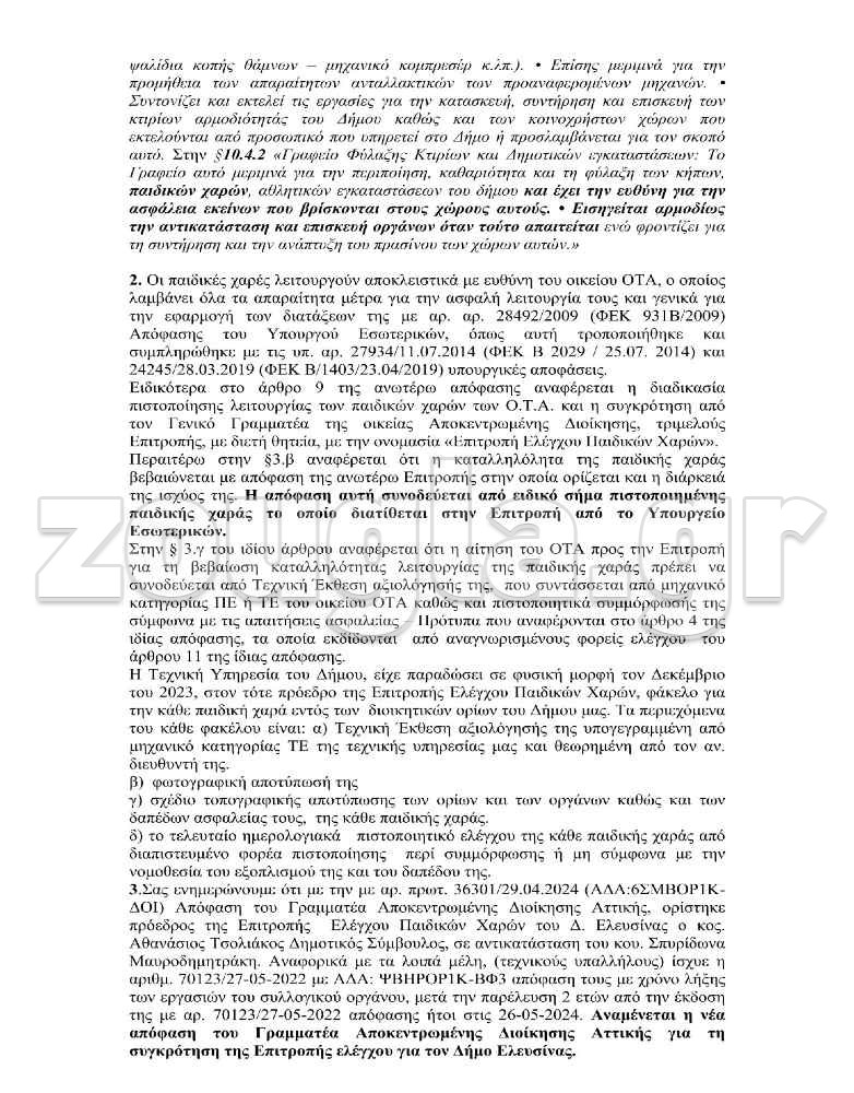 Ωστόσο η Τεχνική Υπηρεσία του δήμου Ελευσίνας απαντώντας στο αίτημα του αντιδημάρχου κ Σεμερτζίδη με την υπ’ αριθμ. 10360/27-05-2024 επιστολή τον καθιστά με απόλυτη σαφήνεια υπεύθυνο και αρμόδιο για τις παιδικές χαρές με μια απλή αναγωγή στον Κανονισμό Εσωτερικής Λειτουργίας του δήμου Ελευσίνας και συγκεκριμένα όπως αναφέρεται στο έγγραφο: