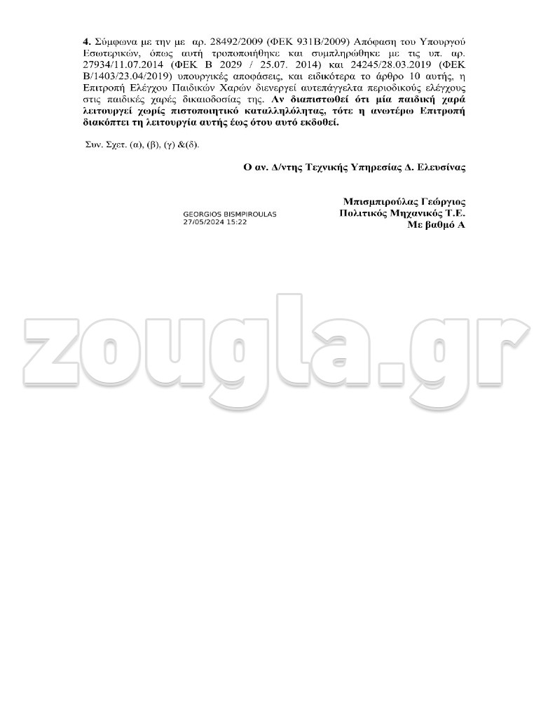 Σε ένα ακόμα έγγραφο που αφορά την κατάσταση των 29 ακατάλληλων και επικίνδυνων παιδικών χαρών στην Ελευσίνα και την Μαγούλα αποκαλύπτεται η διαχρονική ευθύνη και αδιαφορία που επέδειξαν συστηματικά τόσο οι δημοτικές διοικήσεις όσο και οι αρμόδιες υπηρεσίες του δήμου Ελευσίνας. Σύμφωνα με το υπ’ αριθμ Πρωτ. 11252/ 27-5-2024 έγγραφο που υπογράφεται από τον Αναπληρωτή Διευθυντή Τεχνικής Υπηρεσίας του δήμου Ελευσίνας Γεώργιο Μπισπιρούλα και αποστέλλεται στο υπουργείο Εσωτερικών επισημαίνεται ότι «σας γνωρίζουμε ότι ο Δήμος Ελευσίνας για το σύνολο των παιδικών χαρών του, δε διαθέτει το «ειδικό σήμα καταλληλόλητας λειτουργίας» το οποίο χορηγείται από το Υπουργείο Εσωτερικών».