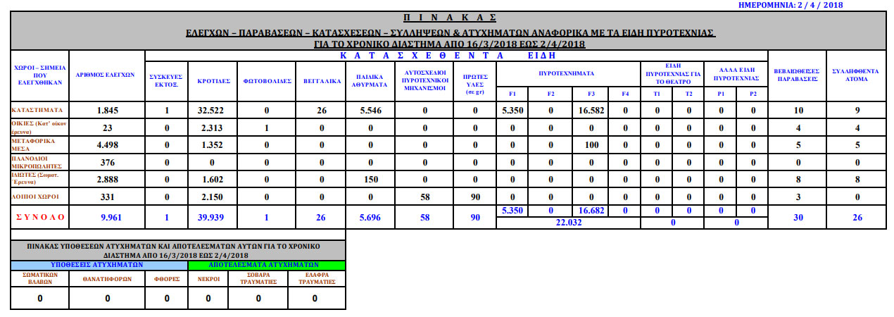 Στη δημοσιότητα έδωσε η Ελληνική Αστυνομία στοιχεία για ελέγχους, παραβάσεις, κατασχέσεις, συλλήψεις και ατυχήματα που σχετίζονται με τα πυροτεχνικά είδη εν όψει των εορτών του Πάσχα από την περίοδο 16/03/2018 έως 02/04/2018.