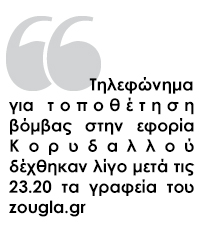 Εκρηκτικός μηχανισμός – που είχε τοποθετηθεί στην είσοδο της εφορίας Κορυδαλλού – εξουδετερώθηκε λίγο μετά τα μεσάνυχτα από την ΕΛ.ΑΣ. ενώ είχε προηγηθεί προειδοποιητικό τηλεφώνημα στα γραφεία του zougla.gr.