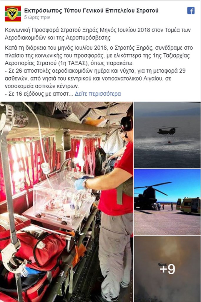 Συγκεκριμένα τα ελικόπτερα της 1ης ταξιαρχίας Αεροπορίας Στρατού εκτέλεσαν 26 αποστολές, ημέρα και νύχτα, για την αερομεταφορά των 29 ασθενών από νησιά του κεντρικού και νοτιοανατολικού Αιγαίου, σε νοσοκομεία αστικών κέντρων.