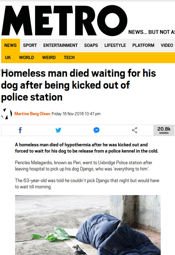 Συνέβη όμως και το αντίθετο. Ένας άστεγος που ζούσε στην Αγγλία, στην πόλη Uxbridge, βρήκε τραγικό θάνατο, περιμένοντας να παραλάβει τον σκύλο του από ένα αστυνομικό τμήμα.