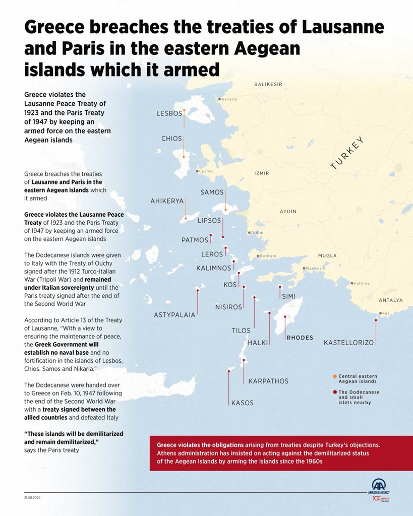 Το τουρκικό πρακτορείο ειδήσεων Anadolu, μπαίνοντας στο πολεμικό κλίμα που καλλιεργούν στο σύνολό τους τα μέσα ενημέρωσης της Τουρκίας, δημοσιεύει έναν χάρτη με τα νησιά του ανατολικού Αιγαίου, υποστηρίζοντας πως διαθέτουν στρατό κατά παραβίαση των Συνθηκών της Λωζάννης και των Παρισίων.