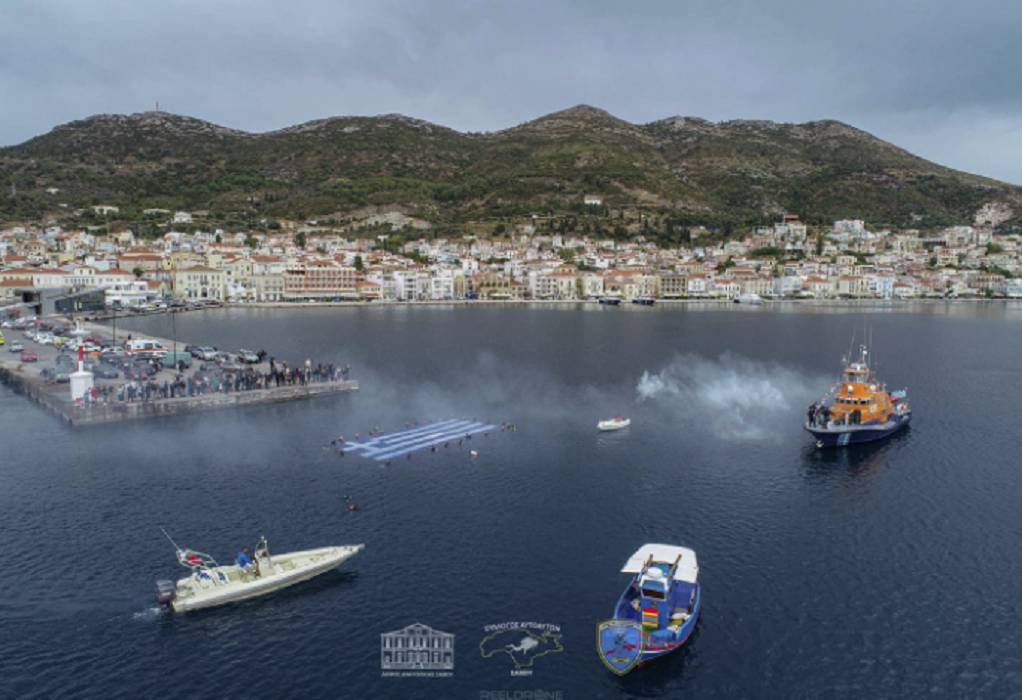 Η ελληνική σημαία «κυμάτιζε» το μεσημέρι της Τετάρτης μέσα από τη θάλασσα, μια πρωτοβουλία του δημάρχου της Ανατολικής Σάμου, όπως λέει ο κ. Σιγανός, προσθέτοντας ότι «η απόφαση για τη συγκεκριμένη δράση πάρθηκε την προηγούμενη εβδομάδα και μόλις μέσα σε μια μέρα ήταν έτοιμη. Ο δήμαρχος είναι ενεργό μέλος του συλλόγου μας και με αυτή τη πρωτοβουλία ήθελε να τιμήσει την σημερινή ημέρα, τάσσοντάς την σε ένα διαφορετικό πλαίσιο εορτασμού».