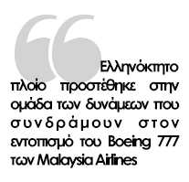 Ένα ελληνόκτητο πλοίο προστέθηκε στην ομάδα των δυνάμεων που συνδράμουν στον εντοπισμό του Boeing 777 των Malaysia Airlines, το οποίο αγνοείται από το περασμένο Σάββατο, όταν ξαφνικά τα ίχνη του χάθηκαν μυστηριωδώς από τα ραντάρ, έπειτα από μία ώρα πτήση.