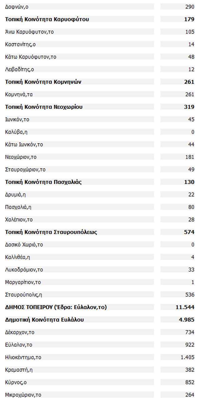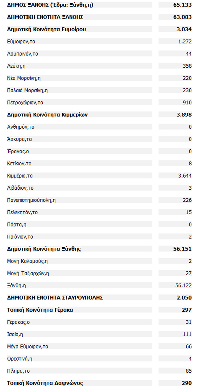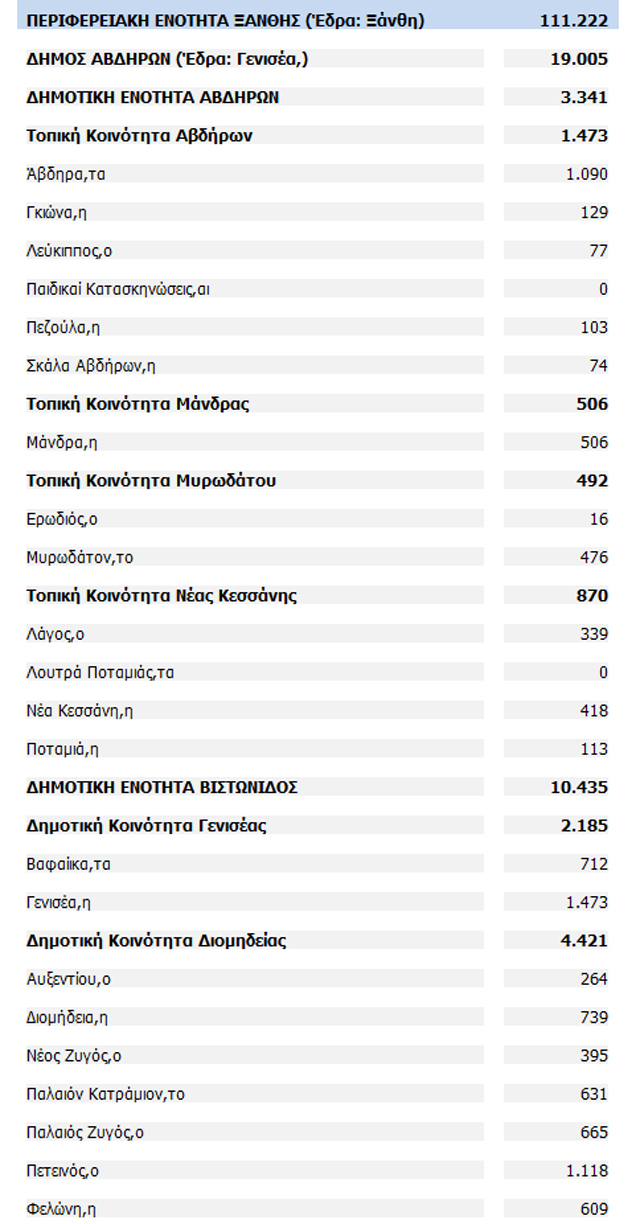 Η Περιφέρεια Ανατολικής Μακεδονίας και Θράκης έχει συνολικά 608.182 κατοίκους, η Περιφερειακή Ενότητα Έβρου 147.944 κατοίκους, η Περιφερειακή Ενότητα Καβάλας/Θάσου 138.687, η Περιφερειακή Ενότητα Ροδόπης 112.039 και η Περιφερειακή Ενότητα Δράμας 98.287. Αναλυτικά ο πληθυσμός σε κάθε Δήμο και οικισμό της Ξάνθης: