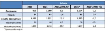 Η έκθεση της ΕΛΣΤΑΤ δείχνει ότι τα τροχαία ατυχήματα που προκάλεσαν θανάτους ή τραυματισμούς τον Ιούνιο σε όλη τη χώρα μειώθηκαν κατά 1,5% σε σύγκριση με τον αντίστοιχο μήνα του 2024, με 1.074 περιστατικά τον Ιούνιο του 2025 έναντι 1.090 τον Ιούνιο του 2024.