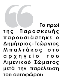 Νωρίς το πρωί της Παρασκευής ο γιος του Τάκη Μπαλτάκου, Δημήτριος-Γεώργιος, παρουσιάστηκε αυτοβούλως στο αρχηγείο του Λιμενικού Σώματος, λίγες ώρες μετά την παρέλευση του αυτοφώρου.