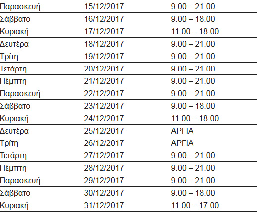 Το προτεινόμενο εορταστικό ωράριο λειτουργίας των εμπορικών καταστημάτων από τον Εμπορικό Σύλλογο Αθηνών για την περίοδο των Χριστουγέννων και της Πρωτοχρονιάς έχει ως εξής: