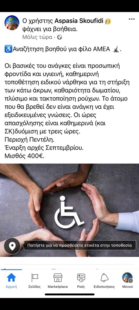 Μένω στην Πεντέλη και, μέχρι το Σάββατο 04/09/2022, είχα προσωπικό βοηθό για τις βασικές καθημερινές μου ανάγκες, που βέβαια πλήρωνα με δικά μου χρήματα. Δυστυχώς, δεν μπορούσε να συνεχίσει τη συνεργασία μας λόγω υποχρεώσεών της. Εγώ, χωρίς βοηθό δεν μπορώ να πάω ούτε τουαλέτα μόνος μου. Ούτε τους μηροκνημοποδικούς κηδεμόνες (για την στήριξη των κάτω άκρων) δεν μπορώ να βάλω μόνος μου. Δηλαδή, εάν δεν έχω βοηθό κάθομαι κλεισμένος στο σπίτι. Βρήκα μια αντικαταστάτρια αλλά της προέκυψε πρόβλημα υγείας, παρέμεινε στο νοσοκομείο γιατί της είπαν ότι έχει καρκίνο.