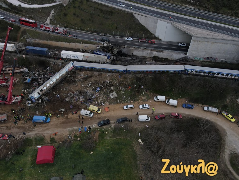 Μπροστά στο χειρότερο σιδηροδρομικό δυστύχημα των ελληνικών σιδηροδρόμων βρίσκονται τα συνεργεία διάσωσης που εξακολουθούν να καταβάλουν τεράστιες προσπάθειες να ανασύρουν ανθρώπους από τα συντρίμμια των συρμών.