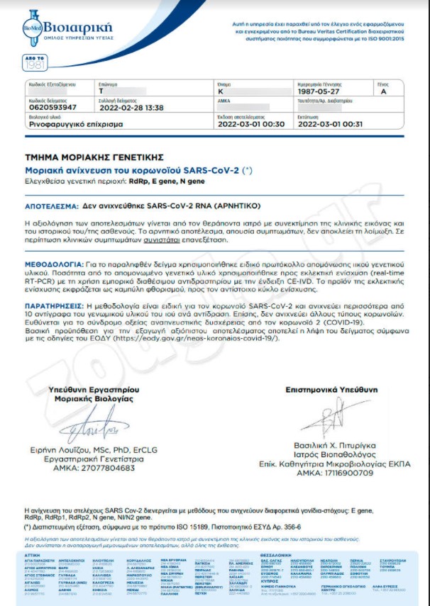 Βάσει πρωτοκόλλου, ο άνθρωπος έπρεπε στη συνέχεια να υποβληθεί και σε μοριακό έλεγχο. Έτσι και έκανε. Τη Δευτέρα το μεσημέρι πήγε σε διαγνωστικό κέντρο και έκανε PCR test.