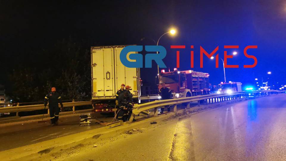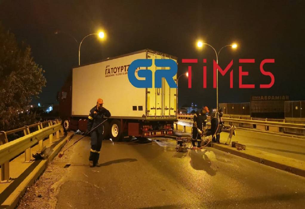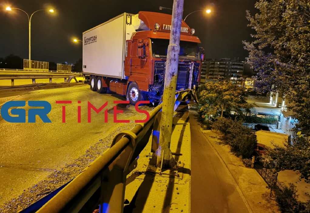Εκτροπή φορτηγού σημειώθηκε περίπου στις 23:30 στη δυτική Θεσσαλονίκη στην αερογέφυρα Ευόσμου – Κορδελιού πάνω από τις γραμμές, στο ύψος Μυτιληνάκια.