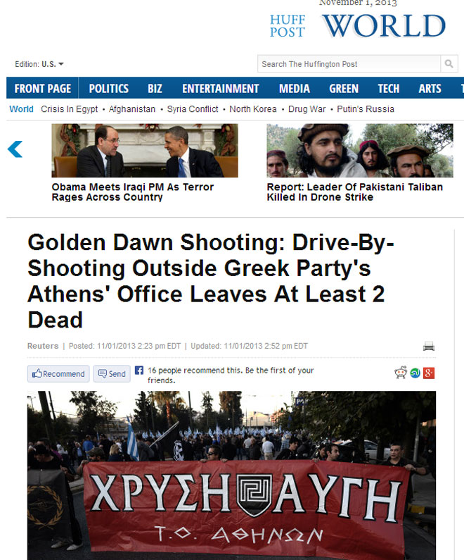 «Πυροβολισμοί στη Χρυσή Αυγή: Διερχόμενοι πιστολέρο έξω από Τ.Ο. στην Αθήνα ελληνικού κόμματος αφήνουν τουλάχιστον δύο νεκρούς» αναφέρει η Huffington Post στον τίτλο του ρεπορτάζ της το οποίο επικαλείται το Reuters.