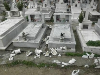 Από τα 400 μνήματα που υπάρχουν στο κοινοτικό νεκροταφείο του χωριού, που είχε θρηνήσει πολλά θύματα από τη ναζιστική θηριωδία, οι άγνωστοι εισβολείς είχαν διαλύσει γύρω στα 150, καταστρέφοντας τα μάρμαρα, ξηλώνοντας και σχίζοντας τις φωτογραφίες των νεκρών και σπάζοντας τα καντήλια, από τα οποία είχαν χυθεί ολόγυρα τα λάδια!