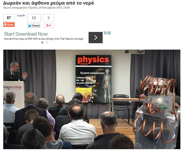 «Πραγματοποιήθηκε την Πέμπτη 29/10/2015 στην Αθήνα εκδήλωση που διοργάνωσε η ΕΕΦ με σκοπό την παρουσίαση της εφεύρεσης του Πέτρου Ζωγράφου, με την οποία επιτυγχάνεται η παραγωγή ηλεκτρικού ρεύματος από νερό, όπως και την διεξαγωγή συζήτησης μεταξύ της ομάδας που υλοποίησε την ιδέα και μελών του ακροατηρίου, το οποίο περιελάμβανε επιστήμονες διαφόρων κλάδων, φοιτητές και μαθητές.