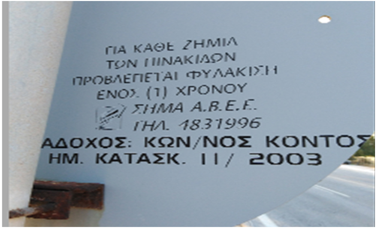 Και αμέσως πιο κάτω παραθέτω την όπισθεν όψη της ανωτέρω πινακίδας η οποία δεν αναφέρει ημερομηνία τοποθέτησής της, αλλά αναφέρει τον κατασκευαστή.