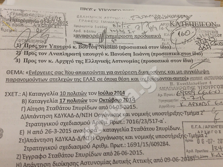 Τον Ιούλιο του 2014, 10 κάτοικοι Περιστερίου, της περιοχής δηλαδή στην οποία διαμένουν τα δύο αδέρφια, κάνουν αναφορά στη Διεύθυνση Εσωτερικών Υποθέσεων της ΕΛ.ΑΣ., στην οποία, μεταξύ άλλων, καταγγέλλουν ότι οι δύο αστυνομικοί παρακολουθούν τους γείτονές τους με κάμερες και κιάλια, δεν αφήνουν κανέναν να παρκάρει μπροστά στο σπίτι τους, βρίζουν και χειρονομούν εναντίον τους και γενικά αντιμετωπίζουν την περιοχή ως… τσιφλίκι τους.