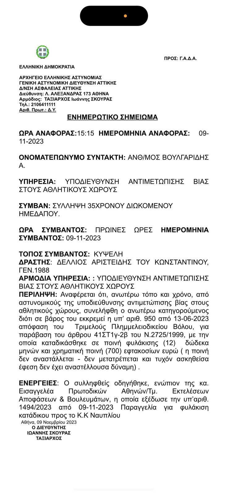 «Αναφέρεται ότι, ανωτέρω τόπο και χρόνο, από αστυνομικούς της υποδιεύθυνσης αντιμετώπισης βίας στους αθλητικούς χώρους, συνελήφθη ο ανωτέρω κατηγορούμενος (Αριστείδης Δέλλιος) διότι σε βάρος του εκκρεμεί η υπ’ αριθ. 950 από 13-06-2023 απόφαση του Τριμελούς Πλημμελειοδικείου Βόλου, για παράβαση του άρθρου 41ΣΤ1γ-2β του Ν.2725/1999, με την οποία καταδικάσθηκε σε ποινή φυλάκισης (12) δώδεκα μηνών και χρηματική ποινή (700) εφτακοσίων ευρώ ( η ποινή δεν αναστέλλεται – δεν μετατρέπεται και τυχόν ασκηθείσα έφεση δεν έχει αναστέλλουσα δύναμη) .